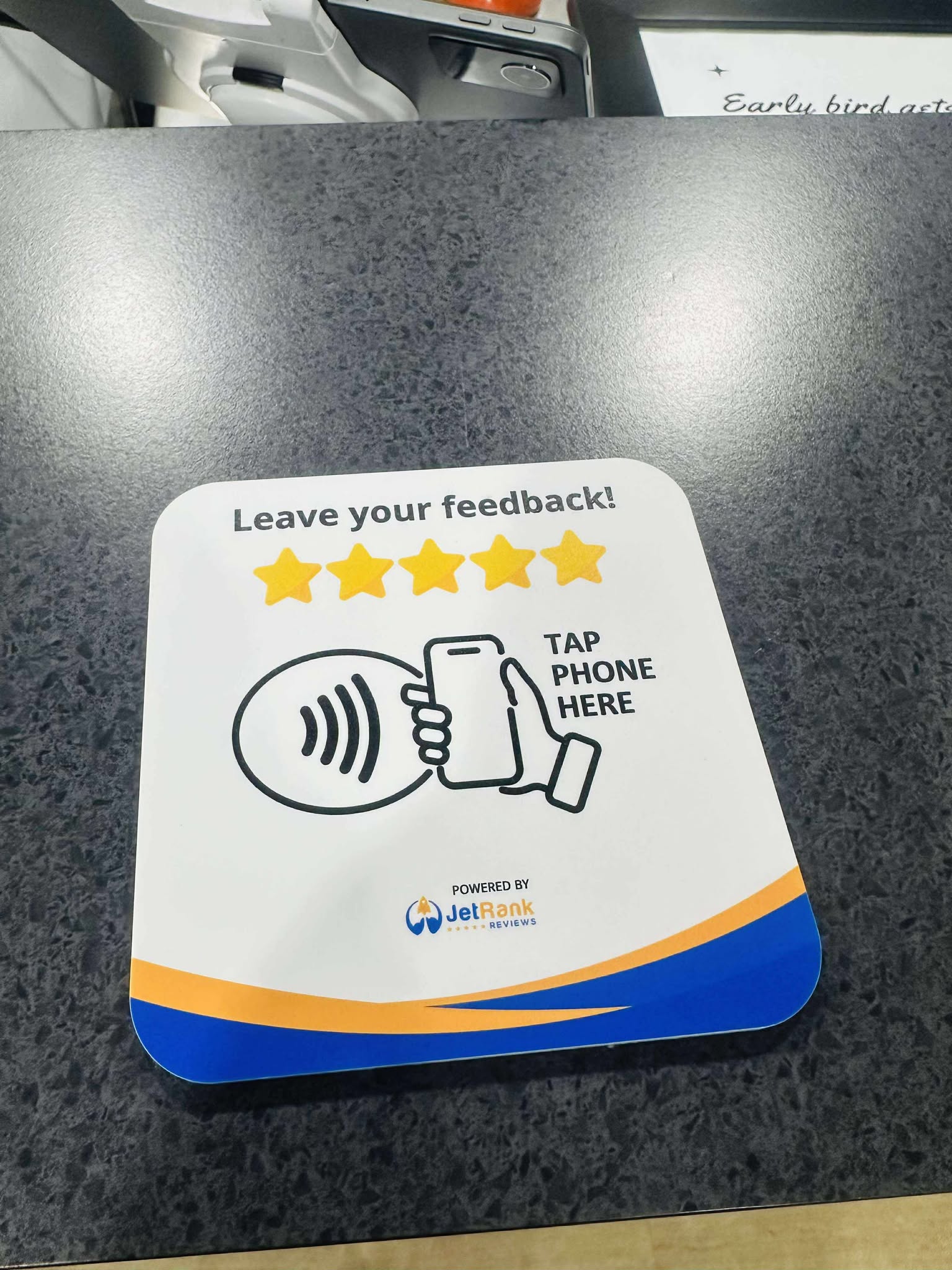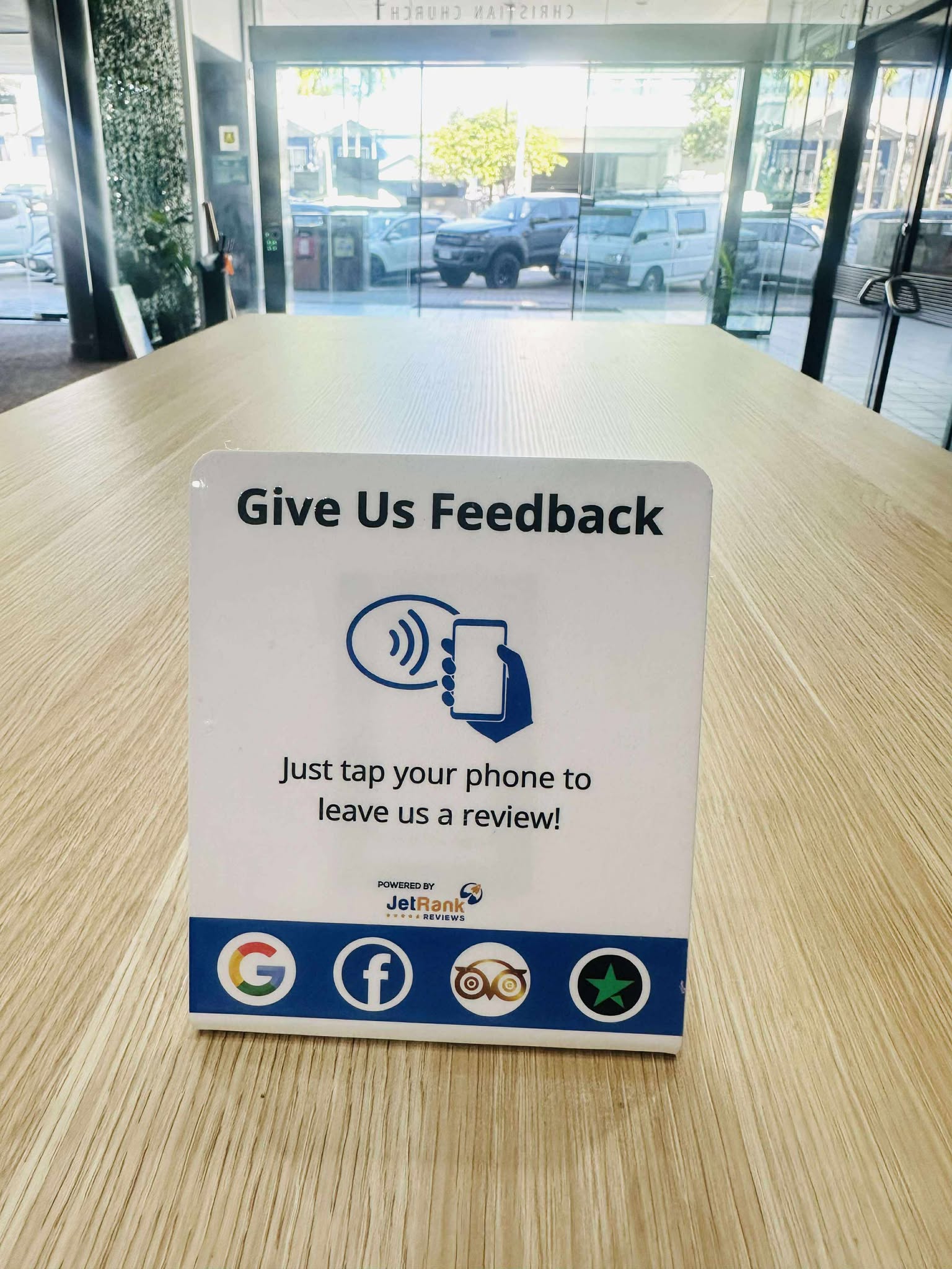 Whether it's on a table in a bar or cafe, or on a nightstand in a hotel room, make it easy and convenient for your customers to review you.